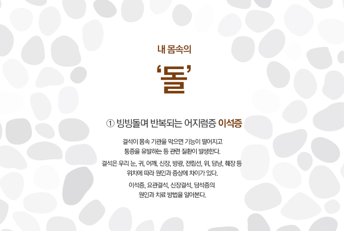 이석증 이 용어는 이름 그대로 귀안에 있는 조그마한 돌멩이를 뜻하는데 일종의 칼슘 부스러기이기도 합니다. 기본적으로 내이에는 이석기관, 세반고리관으로 이뤄진 평형감각기인 전정기관이 있습니다. 그래서 신체 평형감각을 유지해 주는 일을 합니다. 원래 정상적으로 존재를 하면서 인체 선형 움직임을 감지해 주는 역할을 합니다.
