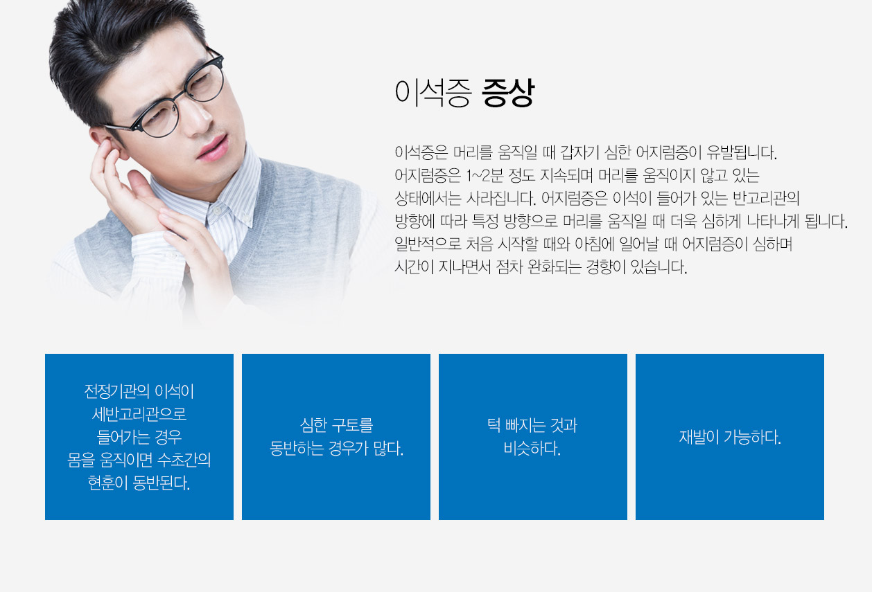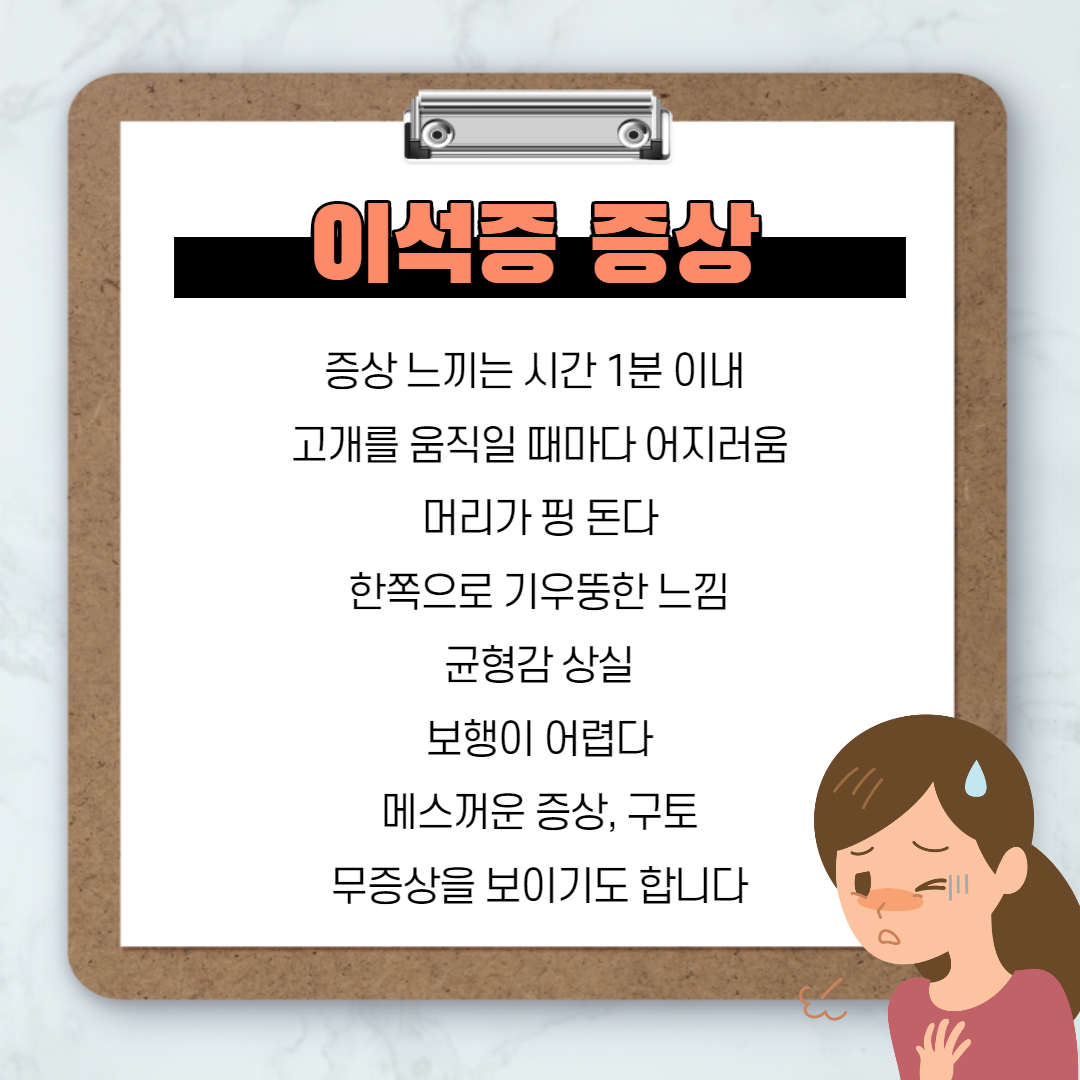 이는 균형을 담당하는 이석이 제 위치에 있지 않고 떨어져 나와 흔들리면서, 신경을 자극하게 되고 균형 잘 잡지 못하고 평형감각을 상실해버리게 되기 때문에 어지럼증과 균형감각 상실 등의 대표 증상과 더불어 구토, 식은땀이 동반됩니다.