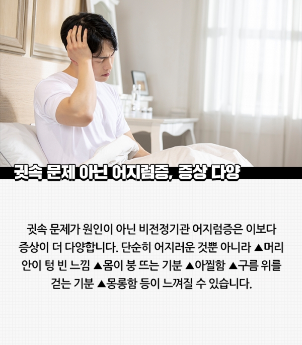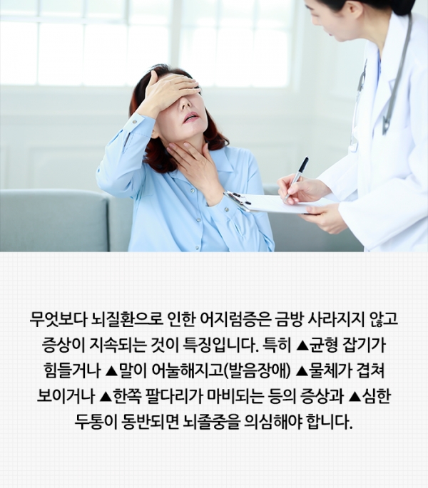 어지럼증은 "코끼리 코 돌기"와 비슷한 느낌이라고 생각을 하면 됩니다. 머리를 움직이거나 아침에 잠자리에 서 일어나거나 돌아누울 때, 혹은 평상시 하늘을 바로 보거나 좌우로 머리를 돌릴 때 어지럼증이 발생이 됩니다. 그와 함께 구역질, 구토, 식은땀 등 정도에 따라 같이 동반이 될 수가 있겠습니다.